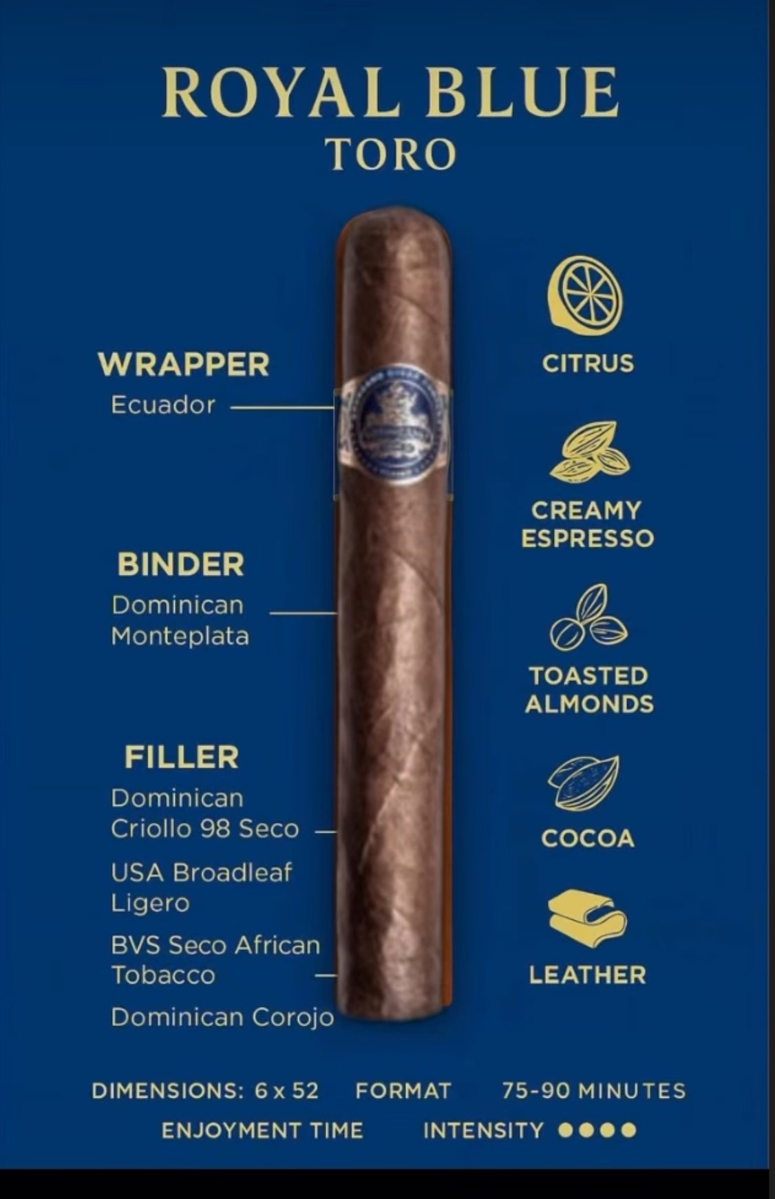 Fillers: Dominican Criollo 98 seco / USA Broadleaf ligero / BVS seco African tobacco / Dominican Corojo